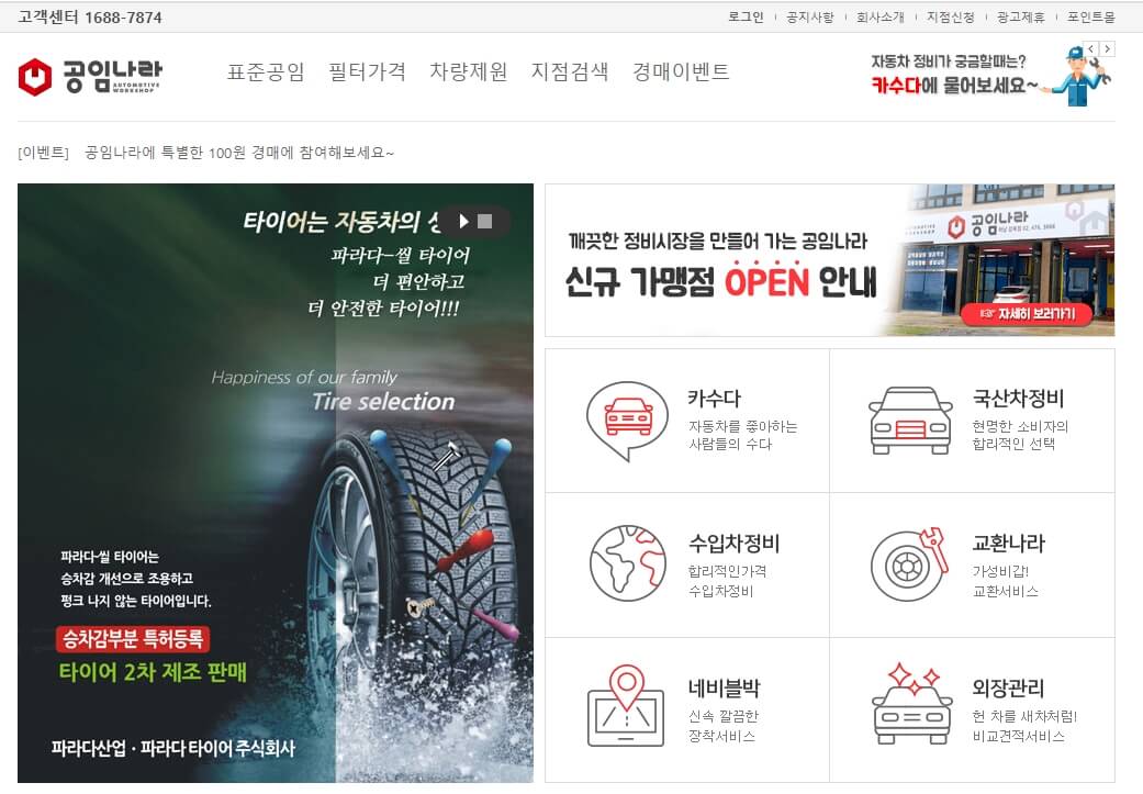 인테넷 검색으로 통해서 표준적인 공임비를 안내하고 있는 사이트를 찾았습니다. 바로 공임나라 사이트 입니다. 주식회사 자동차 공임나라라는 기업에서 운영하고 있는 공식 사이트입니다.