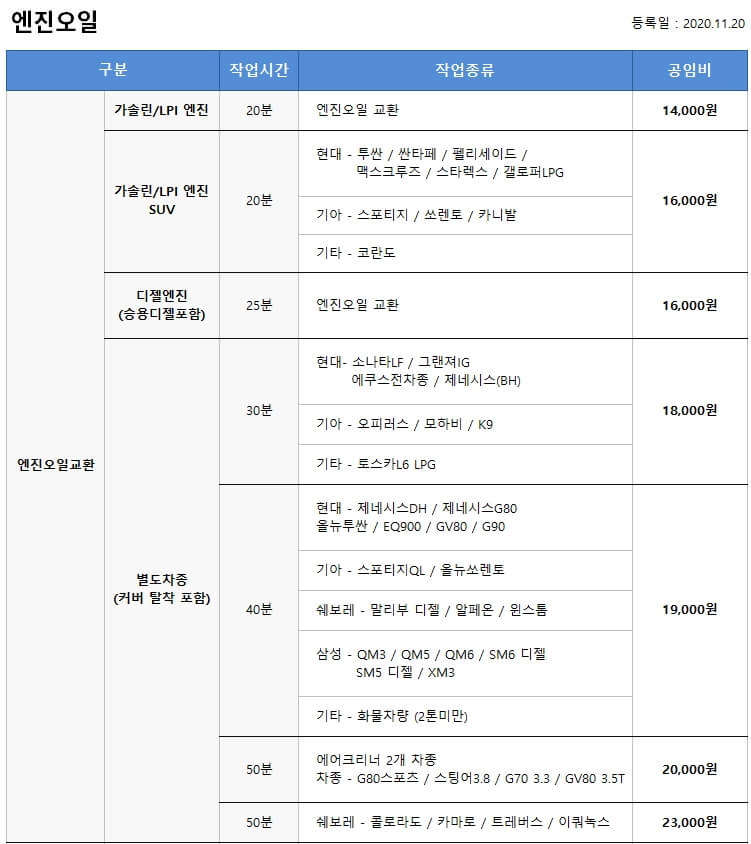 자동차 공임나라 엔진오일 공임비는 기본적인 가솔린에 경우 20분에 작업이 소요되고 2020년 11월 20일에 정의한 표준 공임비는 14,000원입니다. 이외에다 다양한 자동차 부품에 대한 정보를 확인 할 수 있습니다.