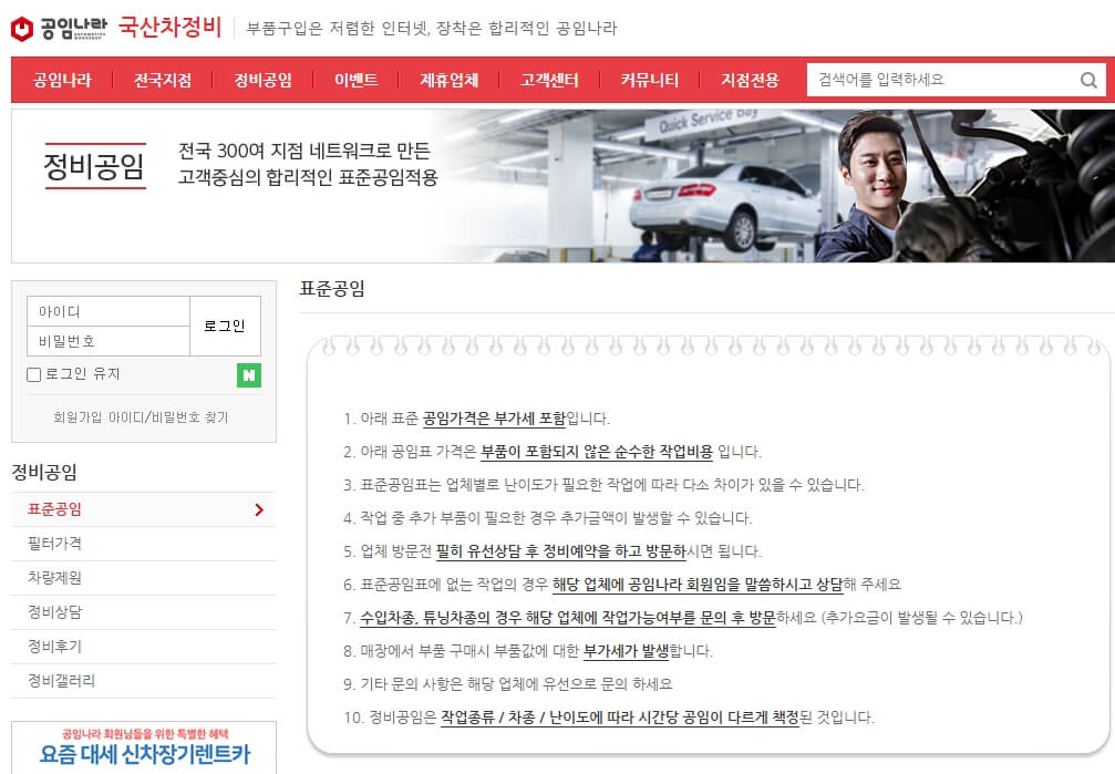 단일에 사이트가 아닌라 전국적으로 네트워크를 구축하고 있는 정비소 분야에 기업에서 운영하고 있는 사이트로 파악됩니다. 해당 사이트에서 표준공임비 이외에도 다양한 자동차 정비 정보를 확인 할 수 있습니다.
