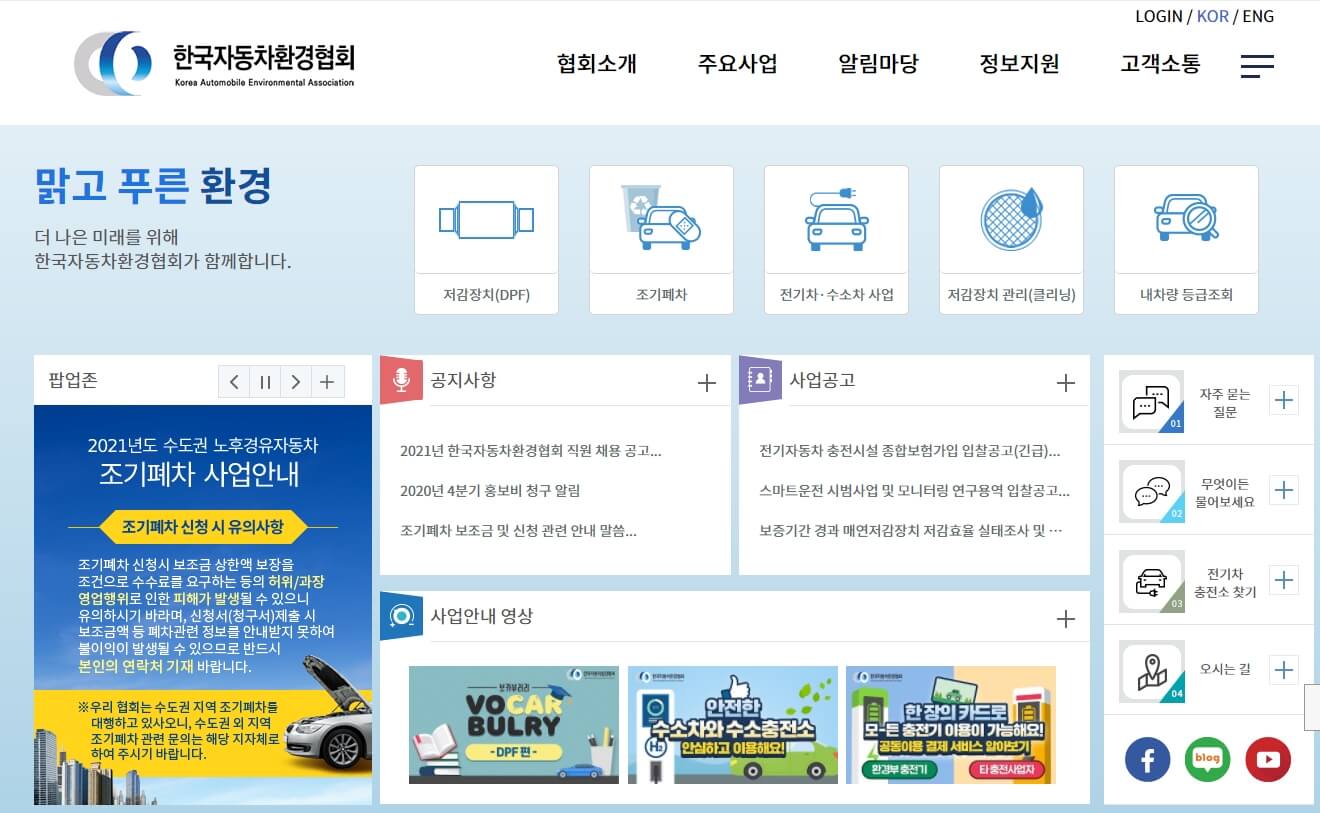 가장 먼저 해당 제도를 수행하는 국가 기관은 한국자동차환경협회이라는 기관이였습니다. 해당 사이트에 접속하면 기관명에 부합하는 다양한 서비슬 제공하고 있습니다.