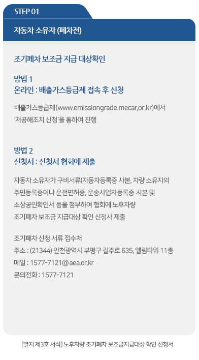 요약하면, 노후 자동차에 발생하는 매연을 줄익 위해서 오래된 경유자동차를 조기폐차할경우 나라에서 보조금을 지원해주는 제도를 의미합니다. 하지만 해당 제동에 경우 모든 자동차에 적용되는 것이아니기 때문에 지원금이 가능한지 검토 및 신청 절차가 필요합니다.