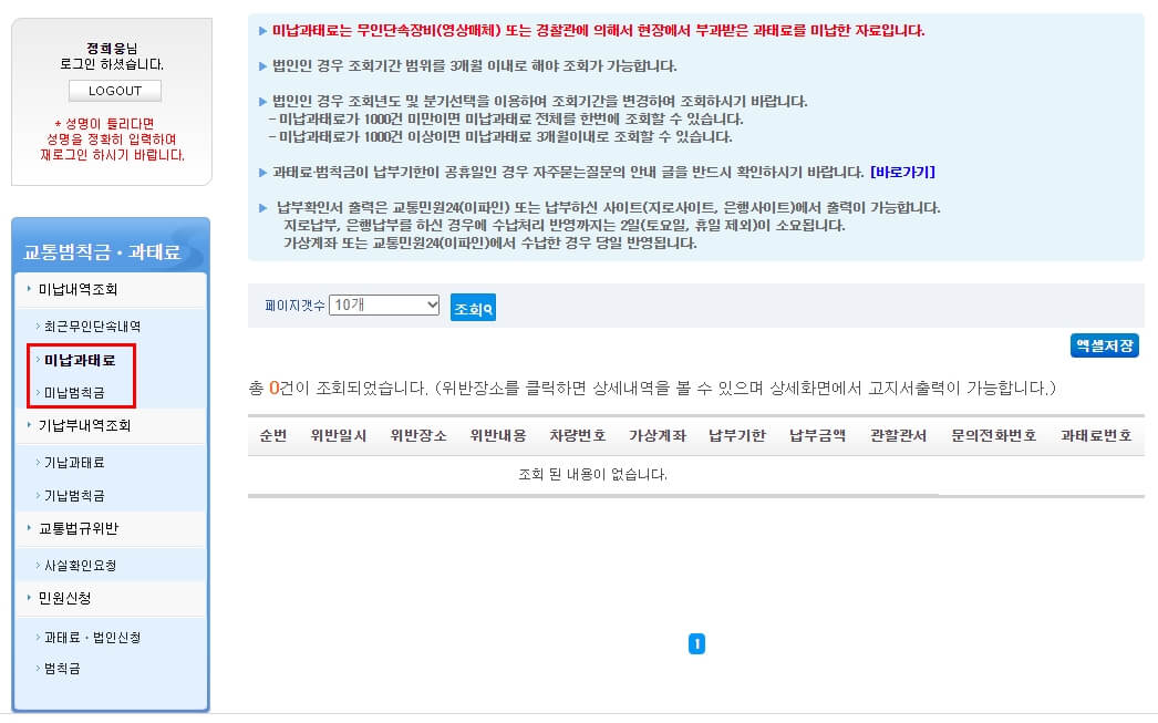추가적으로 미납과태료 및 미납범칙금을 확인해보세요. 해당 메뉴에서 현재 지불해야하는 미납금을 확인 할 수 있습니다. 해당 과태료에 경우는 미납되는 기간이 길어지면 추가적인 비용 지불을 해야하는 것으로 알고 있습니다.