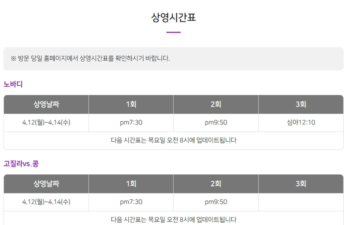 용인자동차 극장에 경우는 특정 상영날짜를 기준으로 상영시간표를 구성하고 있기 때문에 해당 날짜에 관람을 희망하는 영화가 있는지 확인하고 방문하는 것을 추천드립니다.