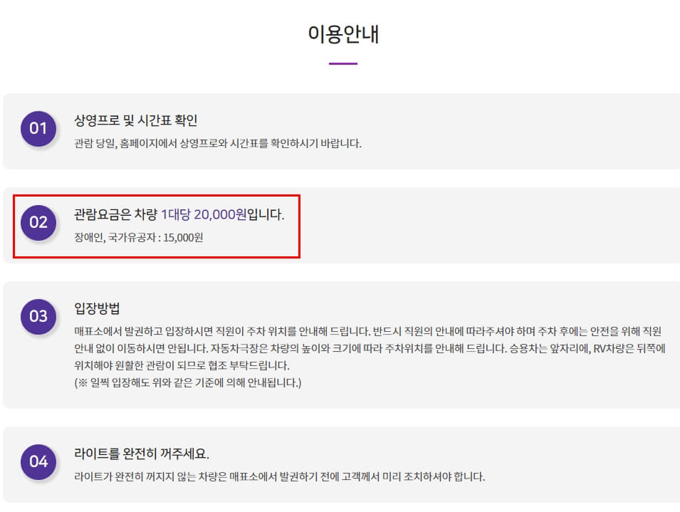 주요 영화에 이어서 용인자동차 극장에 이용 가격을 확인해보았습니다. 관람요금은 차량 1대당 20,000원입니다. 일반적인 영화관 가격보다 저렴하다고 판단됩니다. 단지 아쉬운 점은 제휴카드와 같은 할인 혜택이 부여되지 않는다는 점입니다.