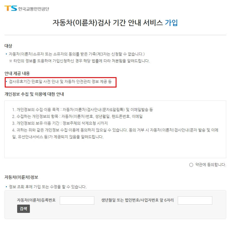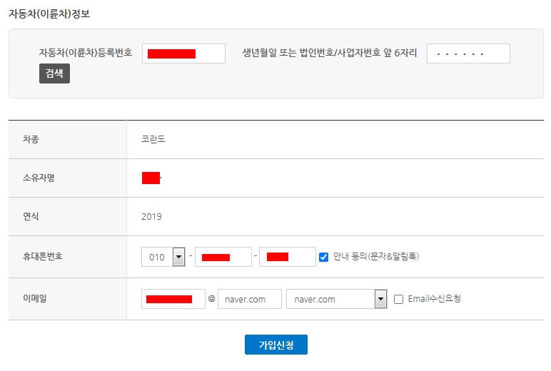 다음과 같이 주요 정보를 다시 입력하고, 정보 동의를 하시게 되면 문자 또는 카카오톡에 알림톡을 통해서 자동차 검사 유효기관 만료전에 알림을 해주는 서비스 신청하면 됩니다. 간단한 정보 입력만으로 이런 서비스에 가입할 수 있다니, 굳이 안할 이유가 없는것 같습니다.