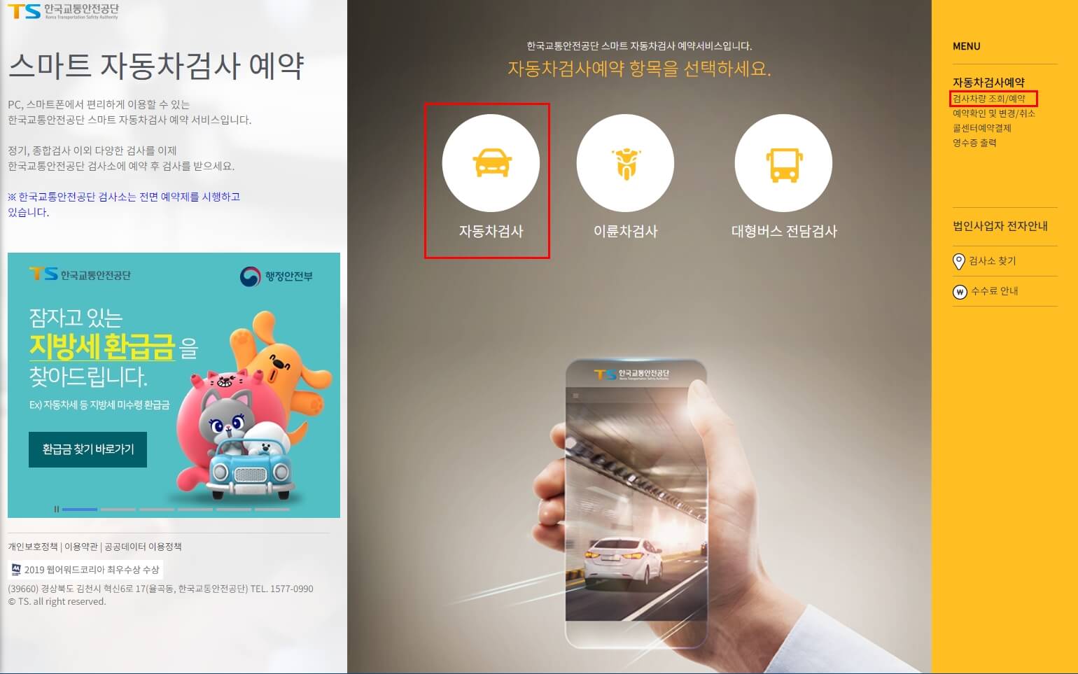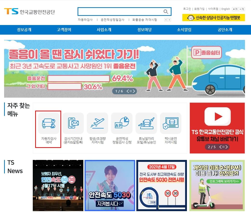 대한민국 법에 따른 자동차 검사를 수행하는 주요 주관 기관은 한국교통안전공단입니다. 해당 공단에 홈페이지에 접속하시면 다음과 같은 메인 화면을 확인 할 수 있습니다.