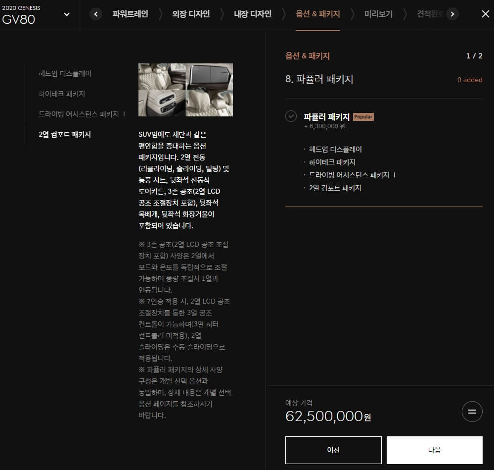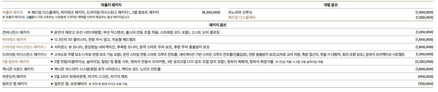 필수 선택 옵션 이외에 개인적으로 제네시스 GV80 풀옵션을 희망하거나 패키지 옵션을 원하는 고객을 위해서 다음과 같은 옵션들이 구성 되어 있습니다. 아마 해당 패키지가 단일 옵션 선택하는 것보다는 할인된 가격으로 옵션을 선택 할 수있는것으로 판단됩니다.
