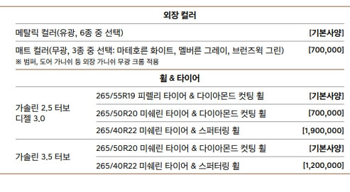 제네시스 GV80 외장 디자인 중에 휠과 타이어 까지 선택할 수 있습니다. 해당 부분에 경우는 다른 차량에도 많이 포함되어 있는 옵션이라고 생각됩니다.