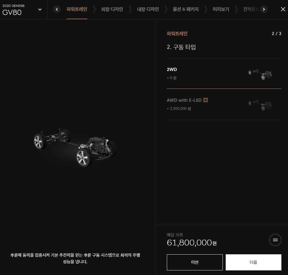 구동타입까지 선택하는 제네시스 GV80에 견적내기 서비스 입니다. 기본 옵션이 아니라 풀옵션에 해당하는 AWD with E-LSD 선택할 경우, 3,500,000원이 추가됩니다.