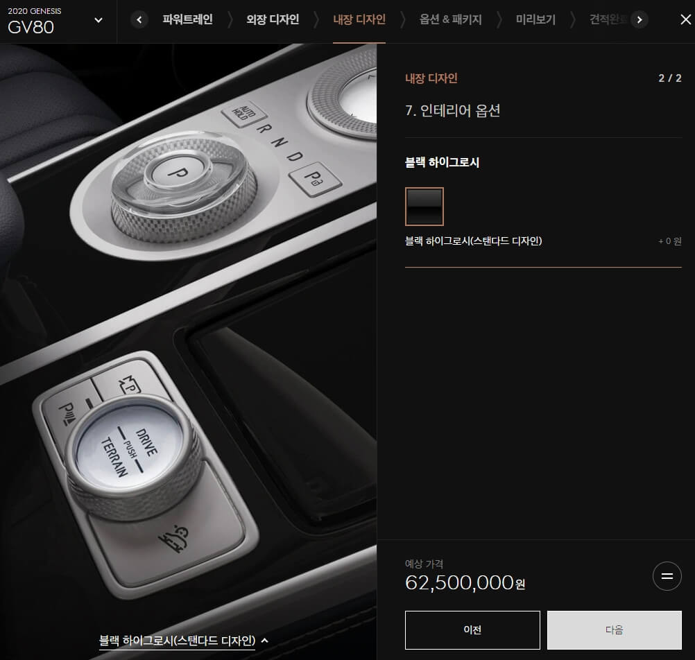 모든 과정을 수행하고 내가 선택한 디자인을 미리 볼 수 있습니다. 추가적으로 제가 선택한 제네시스 GV80 가격표에 경우는 62,500,000원입니다. 거의 기본적인 가격이라고 보시면 됩니다. 예상해보는데 제네시스 GV80풀옵션에 경우의 1억에 가까워지지 않을까 싶습니다.