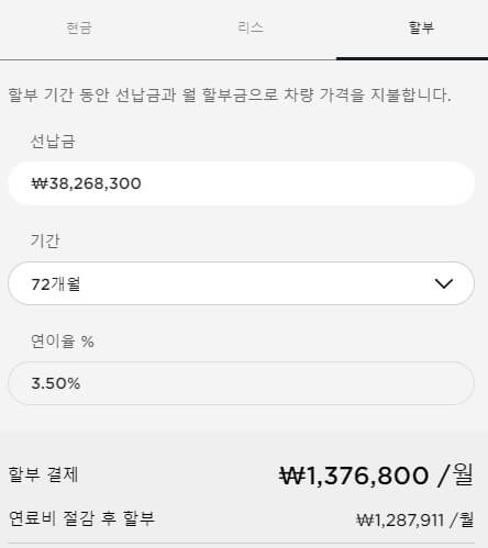 현금으로 이 부담되는 가격을 납부하기는 어렵지 않을까 싶습니다. 테슬라모델x 롱레이진 할부로 납부 할 경우 선납금 38,268,300원을 지불하고 72개월 할부를 진행할 경우 월 1,376,800원을 지불하면 테슬라모델x이 내 소유가 됩니다. 거의 1억이 되는 외제 차량이 내 소유가 되는 순간이죠.