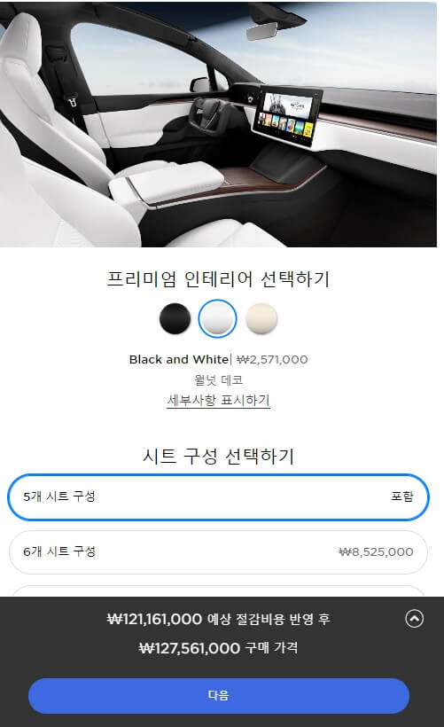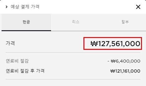 이와 같은 기본 차량, 옵션에 따른 예상 결제 가격을 확인 할 수 있습니다. 기본 옵션으로 자동차를 선택할 경우, 127,561,000원입니다. 여기에 연료비 절감 할인이 적용됩니다. 해당 항목에 경우는 환경 보조금이 아닐까 싶습니다. 해당 부분은 정확하지 추가적인 확인 필요합니다. 또한 보조금에 경우는 기간에 따라서 상이할 수 있으닌 주의하세요.