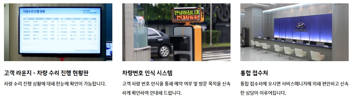 다음으로는 현대자동차 서비스센터에만 있는 편의시설에 대해서 소개해 드리겠습니다. 다른 자동차 브랜드에는 없는 현대자동차 서비스센터 직영점에만 있는 편의시설을 드립니다. 대표적으로 고객 라운지 현황판을 통해서 내 차례가 되면은 눈으로 확인할 수 있는 정보를 제공하고있습니다.