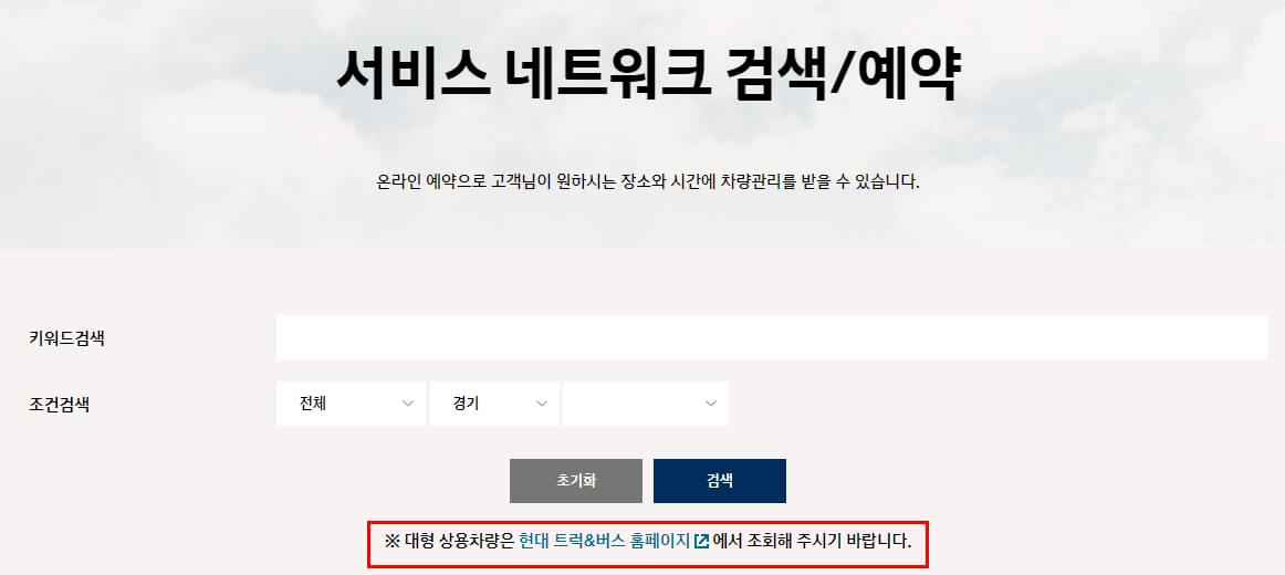 추가적으로 서비스 네트워크 즉, 현대자동차 서비스 센터 직영점을 검색하기 위한 화면입니다. 해당 화면에서 키워드 또는 조건 검색을 통해서 원하는 직영점을 바로 확인 할 수 있습니다.